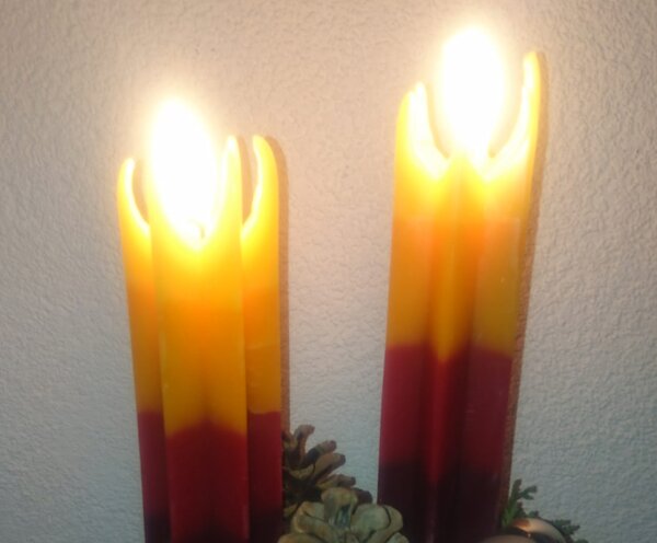 Die Kerzen können mit den vier zur Verfügung stehenden Farben ganz individuell verschieden farbig gezogen werden. Bienenwachs wird nicht mehr angeboten.